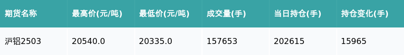 南方财经1月17日电,南财金融终端盘后期货数据显示,上海期货交易所的沪铝主力合约收涨0.81%,收盘报20470.0元/吨,日内资金流入3.23亿元。其他相关指标见下表: